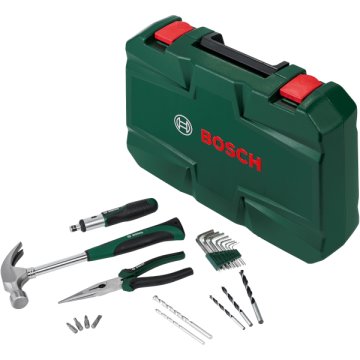Műanyag koffer, mérete: (hxszxm) 370 x 280 x 95 mm, súlya: 3.14 kg.A készlet tartalma: 3 db fafúró, Ø 5/6/8 mm 3 db kőzetfúró, Ø 5/6/8 mm 18 csavarozóbit, L = 25 mm PH 1/2/2/3 PZ 1/2/3 S 4/5/6/6 T 15/20/25/30 HEX 4/5/6 6 db dugókulcs, Ø 6/8/9/10/11/13 mm 8 db imbuszkulcs, Ø 1,5/2/2,5/3/4/5/5,5/6 mm 30 csavar 10 db: 3 x 30 mm 10 db: 4 x 35 mm 10 db: 5 x 50 mm 30 tipli 10 db: 5 x 30 mm 10 db: 6 x 30 mm 10 db: 8 x 35 mm 1 db kombinált fogó, 1 db laposfogó, 1 db kalapács, 1 állítható villáskulcs, 1 db racsnis csavarhúzó (jobbra/balra forgás), 1 db vágókés, 1 db rugalmas hosszabbítás, 1 db mérőszalag, 1 db kézifűrész, 3 db fűrészlap, 1 adapter dugókulcshoz