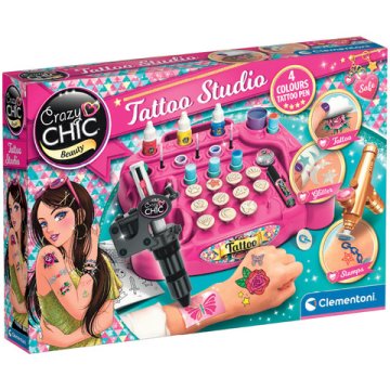 A készlet tartalmaz testfestékeket a tetoválások színezésére, szivacsokat, applikátorokat, sablonokat és egy tetoválókönyvet rajzokkal.