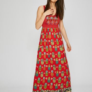 Ruha kollekció Desigual. Mintás anyagból készült egyenes modell. - Egyszerű stílus. - Kerek nyakkivágás. - Derékban vágás. - Vékony és rugalmas anyag. - Hosszúság: 144 cm. - Hónalj alatti szélesség: 33 cm. - Megadott méret: bordás maxi Összetétel: Alapanyag: 5% poliamid, 3% poliészter, 91% viszkóz, 1% fémszál Gondozási tippek: Nie czyścić chemicznie Termék azonosító: 4921-SUD07T Gyártó kód: 18SWVWE0