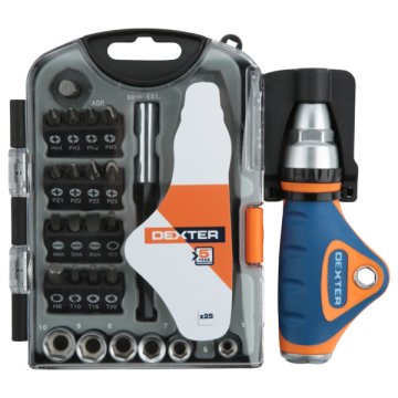DEXTER SCREWING SET (25PCS) : 1 Ratchet Torque Driver 1 Adapter 16 CR-V Bits 1 90mm Extension Bar 6 Sockets (sizes: 5 - 6 - 7 - 8 - 9 - 10mm)
