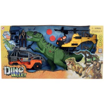 A játékkészlet 1 dinoszauruszt, 1 helikoptert, 1 jeepet, 1 figurát és különböző kiegészítőket tartalmaz. A dinoszaurusz fényt és hangot is ad ki.