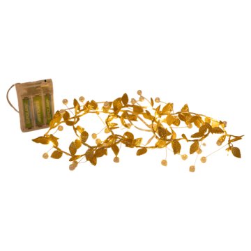 Mesés hangulat egész évben! A 15 darab, meleg fehér Led-del , arany színű levelekkel és gyöngyökkel díszített fényfüzér, kellemes, hangulatot biztosít bármely térben. Csak beltéren használható, IP20 védelemnek köszönhetően. 3 db AA elemmel működik. Időzíthető. Méretek & tartozékok: Díszítés: Arany színű levelek és gyöngyök Fényfürt hossza: 140 cm tápkábel nélkül Tápkábel hossza: 30 cm Tápkábel színe: átlátszó Díszíts stílusosan, világíts otthonosan – válaszd a Eurolamp fényfüzérjét, és tedd különlegessé minden pillanatot!