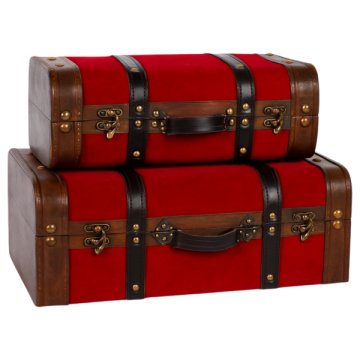 Élvezd a karácsonyi, meghitt hangulatot minden évben. Különleges piros színű bőrönd szett, amely fából készült, kiválóan alkalmas karácsonyi dekorációra. Kinyitva tehetünk bele gömböket vagy ajándékcsomagokat. Méretei: 45x30x18.5cm and 37x24x13.5 cm.