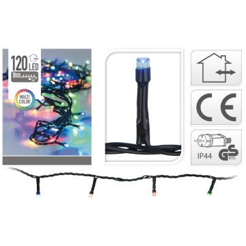 Kültéri 120 LED-es színes fényfüzér. 5 mm-es gömbök, 3 m vezeték, zöld vezeték. 7,5 cm távolság a LED-ek között. IP44 adapterrel. 230V. 50 Hz, 31-120mA, 3,6VA. Vezeték keresztmetszet : 0,15mm2.