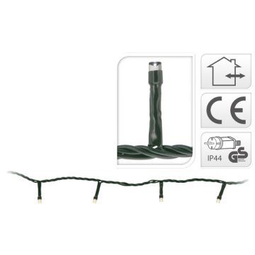 Kültéri 40 LED-es extra meleg fehér fényfüzér. 5 mm-es gömbök, 3 m vezeték, zöld vezeték, keresztmetszet : 0,15mm2. 7,5 cm távolság a LED-ek között. IP44 adapterrel. 230V 50Hz, 4,5V-300mA, 13,5VA.