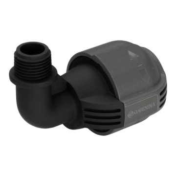 Biztonságos csatlakozás A GARDENA Sprinklersystem részét képező GARDENA 25 mm x 1/2" külső menetes L-elemmel S 80 süllyesztett esőztető (cikkszám: 1569-26) vagy T 100 vagy T 200 turbinás esőztető (cikkszám: 8201-29 és 8203-29) csatlakoztatható a csővezeték végére. A szabadalmaztatott "Klikk és Kész" gyorscsatlakozási technológiának köszönhetően az össze- és szétszerelés egyszerűen, szerszám nélkül történik - csupán a csavaros csatlakozást kell 140°-kal elforgatni. Az L-elem a biztonságos, szivárgásmentes működés érdekében öntömítő menetcsatlakozással rendelkezik.