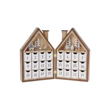 ANYAGA: FA, MÉRET: 20X31X10CM, BARNA SZÍNŰ HÁZ, FEHÉR SZÍNŰ DOBOZOK,24 DB FIÓK, 8 MELEG FEHÉR LEDDEL,ELEMMEL MŰKÖDIK: 2X AAA ELEMET NEM TARTALMAZ