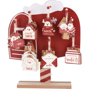 ANYAGA: FA, MÉRET: 7X8X0,3CM, A TARTÓ MÉRETE: 48X40X9CM, 6 FÉLE MODELL: TÉLAPÓ KÖZÉPEN LEVÉL/ TÉLAPÓ JOBB OLDAL LEVÉL/LETTERS TO SANTA CSÍKOS/ LETTERS TO SANTA HÓPEHELY/ LETTERS TO SANTA PIROS KERETES/ LETTERS TO SANTA - FEHÉR