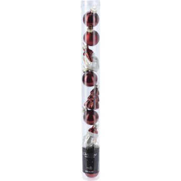 ANYAGA:ÜVEG, CSŐMÉRET: 34X3CM,SZÍN: BURGUNDY , SZETT TARTALMA: 6X GÖMB- 3 CM, FIGURÁK: 2X MIKULÁS, 1X FA.