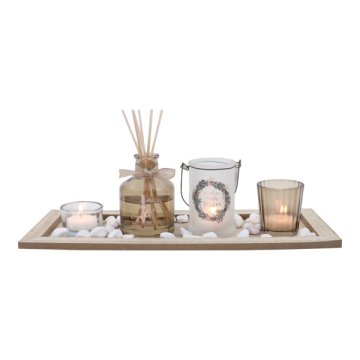 TARTALMA: 1 DB DIFFÚZOR 100ML, 2 DARAB ÜVEGTARTÓ, 1 DARAB FA TÁLCA DEKORÁCIÓ, 3 DB TEAMÉCSES, 1X ZSÁK DECO KÖVEK,