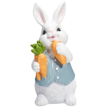 Dekor nyuszi 10X6X4,2cm poliszton 4 féle: FEHÉR NYUSZI VIRÁGGAL, FEHÉR NYUSZI SÁRGARÉPÁVAL, BARNA NYUSZI HÚSVÉTI TOJÁSSAL, BARNA NYUSZI KOSÁRRAL,ANYAGA: POLISZTON