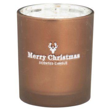 ANYAGA:viasz, üveg, MÉRET: 8X7X7 CM, 3 SZÍNBEN: SÖTÉTBARNA, BARNA, PEZSGŐ, MERRY CHRISTMAS SZÖVEGGEL,