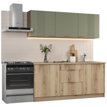 A Teya konyhablokk modern és stílusos kialakításának köszönhetően tökéletes választás minden otthonba. A kompakt, mégis praktikus 180 cm-es konyhaszekrény összeállítás tartalmaz minden szükséges elemet a kényelmes és rendezett konyhai munkához. Összeállítás tartalma: - Fali szekrény: 3 db (60/60 cm) - Alsó szekrény: 1 db (60/82 cm) - Alsó szekrény: 1 db (60/82 cm, 3 fiókos) - Alsó szekrény: 1 db (60/82 cm, mosogatóhoz kialakítva) - Munkalap mérete: (SzxMexMag) 180x60x2,8 cm - Alsó elemeknek blokk mérete: (SzxMexMag) 180x45x82 cm - Felső elemeknek blokk mérete: (SzxMexMag)180x30x60 cm Anyaghasználat és kivitel: - Korpusz: Artisan tölgy - Felső front: MDF, 16 mm, Matt szürkés-zöld, marással - Alsó front: 16 mm forgácslap, Artisan tölgy - Lábazat: Artisan tölgy - Fogantyú: Arany 212 mm - Fiókvezetők: teleszkópos (soft-close nélkül) - Pántok: soft-close nélküli