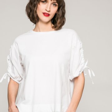 Top kollekció Medicine. Sima dzsörzéből készült modell. - Egyszerű stílus. - Kerek nyakkivágás. - Vékony, rugalmas anyagból. - Fűzött modell. - Dekoratív eldolgozások. - Hosszúság: 61 cm. - Hónalj alatti szélesség: 52 cm. - Megadott méret: S. alap modell alkalmi Összetétel: Alapanyag: 100% pamut Termék azonosító: 6921-TSD601 Gyártó kód: RS18.TSD601