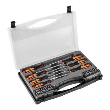 NEO csavarhúzó és csavarhúzó bit készlet (kat. sz.: 04- 197) 27 db kiváló minőségű elemből áll. Mindegyik csavarhúzó szára nagy ellenállóképességű, hosszú biztosító CrV acélból készült. A csavarhúzók hegye mágneses. A markolat három élű hasáb alakja a kialakított hüvelyktámasszal csökkenti a kéz megterhelését munka közben, és megkönnyíti a megfelelő forgatónyomaték elérését. A bimateriál markolat nem csúszik ki a kézből, ellenálló vegyszerek, kenőolajok és zsírok hatásának. A NEO márka a professzionális igényeket is kielégíti.
