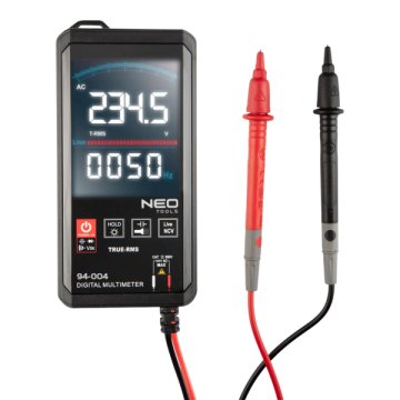 A NEO 94-004 digitális mérőműszer egy modern eszköz, amely sokoldalú funkciókat kínál az elektromos mérésekhez. A készülék 5999-ig megvilágított LCD kijelzővel rendelkezik, amely érintőképernyővel és praktikus zseblámpával van ellátva a könnyű használat érdekében. Két mérőszondával is rendelkezik a kényelmes méréshez. Ez a digitális színes mérő automatikus felismeréssel, NC elektromos mező érzékeléssel, hold funkcióval és áramkör folytonossággal rendelkezik, hogy sokoldalúbbá tegye a méréseket. A True RMS funkcióval a készülék pontosabb eredményeket képes nyújtani. A frekvencia mérése 10 Hz-től 8 MHz-ig terjed, az ellenállás meghatározása pedig 0,1-60M Ω tartományban lehetséges. A mérőműszer feszültségmérése váltó- és egyenáramú üzemmódban egyaránt lehetséges, legfeljebb 600V-ig (AC és DC) Cat II 600V kategóriában. Emellett a környezeti hőmérsékletet is mutatja. Beépített hangjelzéssel és praktikus nyakkendőcsipesszel rendelkezik a még kényelmesebb használat érdekében. A mérőműszer kompakt méretekkel rendelkezik (139x68x18mm) és könnyű (csupán 175g), így ideális hordozható eszköz. A tápellátását 2xAAA elem biztosítja (nem tartozék). A NEO 94-004 digitális mérőműszer a profik és a barkácsolás szerelmesei számára egyaránt ideális választás a precíziós mérésekhez.