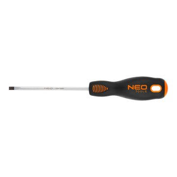 NEO lapos csavarhúzó. A csavarhúzó szára kivételesen ellenálló S2. A csavarhúzó hegy hőkezelésnek lett alávetve, így megfelelő, 56 HRC keménységet és hajlítószilárdságot ért el. A csavarhúzó hegye mágneses. A markolat három élű hasáb alakja a kialakított hüvelyktámasszal csökkenti a kéz megterhelését munka közben, és megkönnyíti a megfelelő forgatónyomaték elérését. A bimateriál markolat nem csúszik ki a kézből, ellenálló vegyszerek, kenőolajok és zsírok hatásának. A NEO márka a professzionális igényeket is kielégíti.