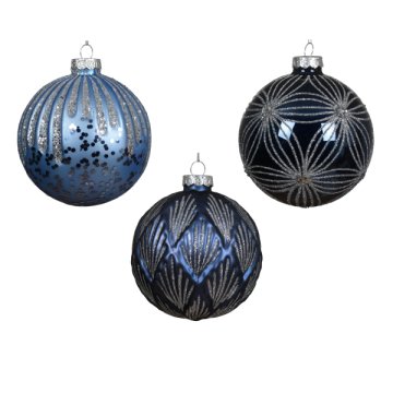 Üveggömb 10cm kék díszitett 3 féle matt/fényes