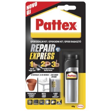 A Pattex Repair Express egy gyorsan kötő, kétkomponensű epoxi gyurmaragasztó, amely összegyúrva fehér színű ragasztómasszát képez. Néhány javítanivaló várhat, de a Pattex Repair Express gyors megoldást nyújt. Helyrehoz, javít és kitölt és sokféle anyag összeragasztható vele, pl. fa műanyaggal vagy fémmel. A Pattex Repair Express kiváló nedves felületekhez is, száradás után csiszolhatú, fúrható, átfesthető. Bel- és kültéren is alkalmazható. A következő anyagok ragasztására alkalmas: fa, fém, kerámia, kristály, tégla, gipsz, műanyag, parafa, réz. Nem alkalmas: polietilén, polipropilén és teflon felületekre. - Fehér színűre szárad - Csiszolható, fúrható, festhetô - Kézzel könnyen gyúrható - Bőrsemleges védőkesztyű használata nem szükséges Kiszerelés: 48 G