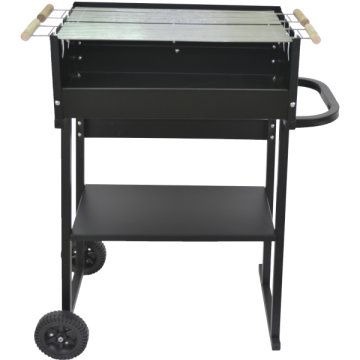 Faszenes Grill 83,5X50X90cm Állítható magasság Könnyen összeszerelhető Könnyen tisztítható Főzőrács: 57,5 X17 cm 2 db fa krómozott fogantyúval Tűzhely: 60X39X8,5 cm fém fogantyúval Négyszögletes láb 2 db műanyag kerekekkel