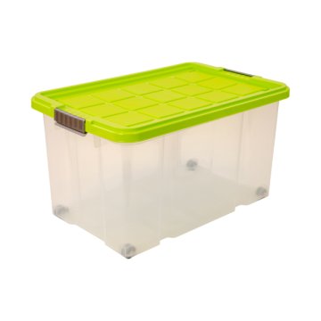 Tárolódoboz nagy fedéllel és kerékkel. Piros, kék, lime zöld és antracit színű lezárható tetővel.
