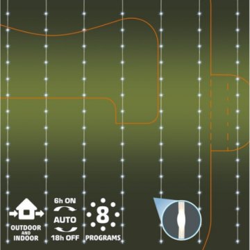 kül- és beltéri kivitel 200 db hidegfehér LED 8 világítási mód, memóriás választható ismétlődő időzítés (6h ON/18h OFF) átlátszó vezeték tápellátás: kültéri IP44 hálózati adapter 2m x 2 m befoglaló méret 10 füzér, füzértávolság 20 cm 10 cm LED-távolság 5 m tápvezeték