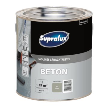 SUPRALUX BETON PADLÓ ÉS LÁBAZATFESTÉK 3L SZIKLA - Kül-és beltérre egyaránt ajánlott, különösen betonfelületekre ,mert megvédi a vasbetont a korróziótól. Kerámia burkolólapokra alkalmas. Aszfaltra nem ajánlott. - Sűrűség, g/liter: 1140-1200 színtől f}ggően - Hígítás: Supralux Szintetikus Hígító max 10-15% az első rétegnél, második réteg: hígítást nem igényel. - Kiadósság: 7-9 m2/l egy rétegben - Száradási idő: 20°C-on max. 6 óra, Átfesthető: 24 óra után