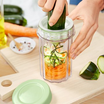 Ideális egészséges salátákhoz és harapnivalókhoz Pl. cukkíniből, sárgarépából és uborkából készült zöldségspagettihez Szivárgásmentes fedéllel Pengék edzett pengeacélból Tölcsérbetéttel az ujjak védelméért - apró zöldségdarabok biztonságos belecsavarásához Tisztítóeszközzel Mosogatógépben tisztítható